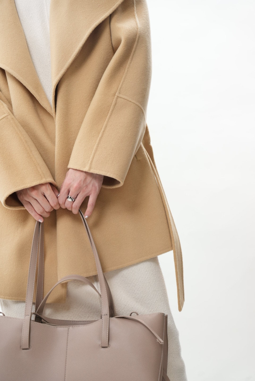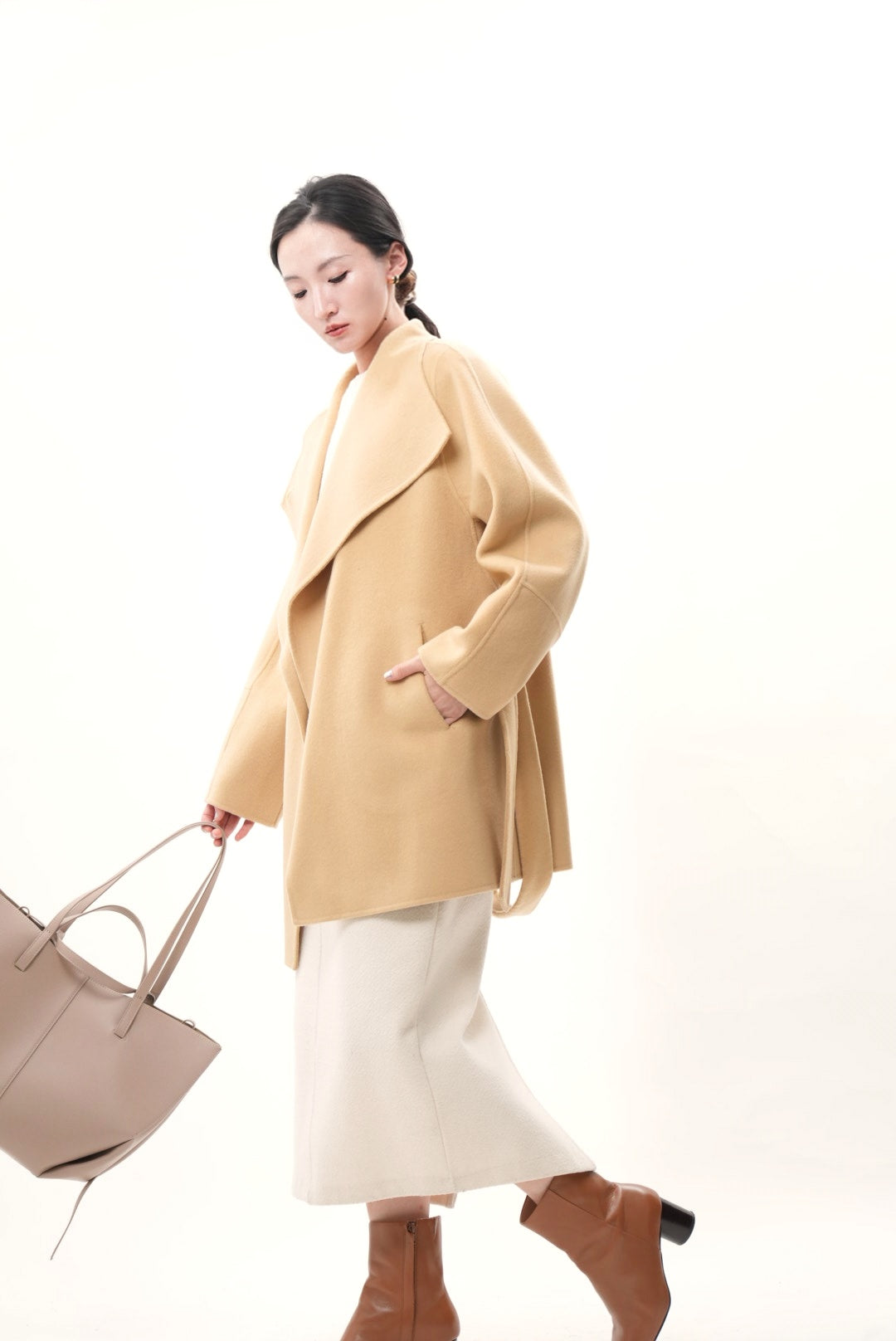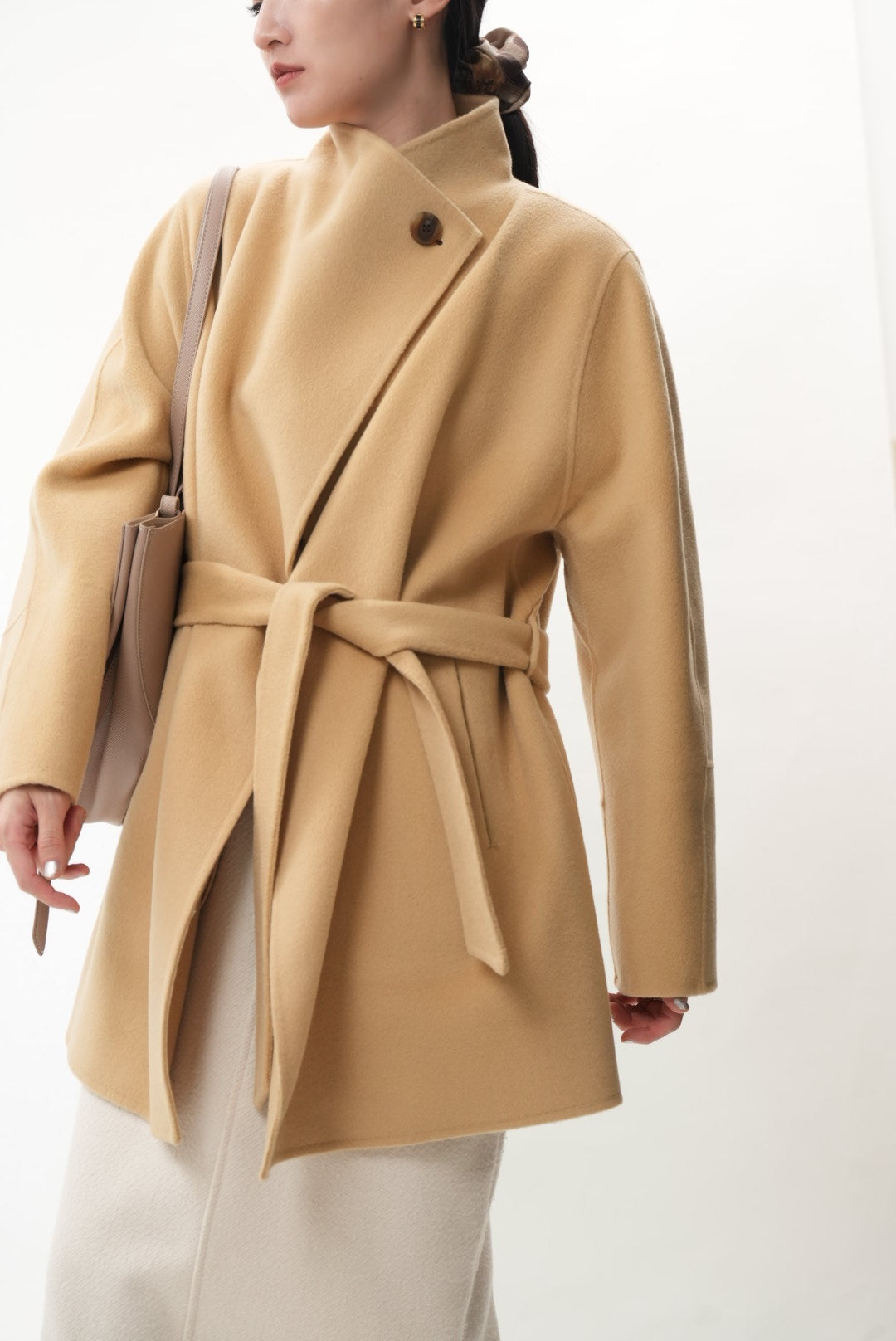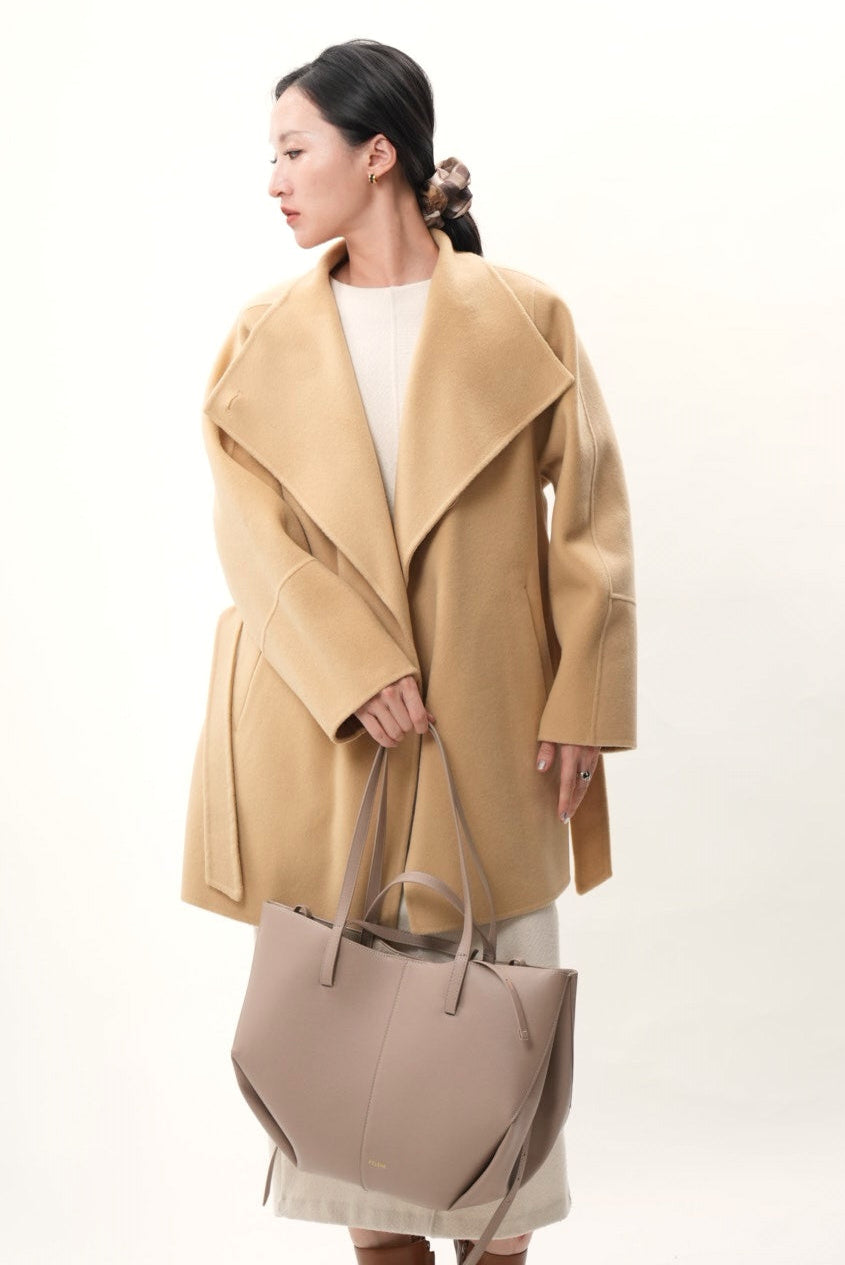 上質なウールとカシミヤを贅沢にブレンドした、柔らかく包み込むような着心地のショートコートです。ウールの暖かさとカシミヤ特有のしなやかな風合いが調和し、軽やかで上品な印象を与えます。