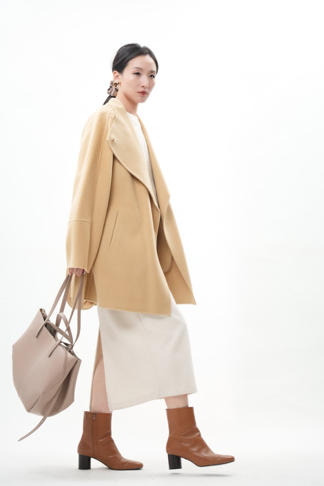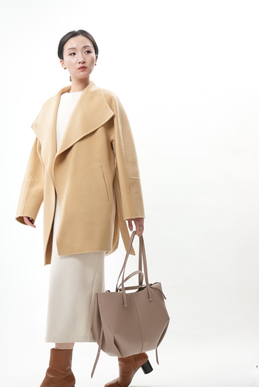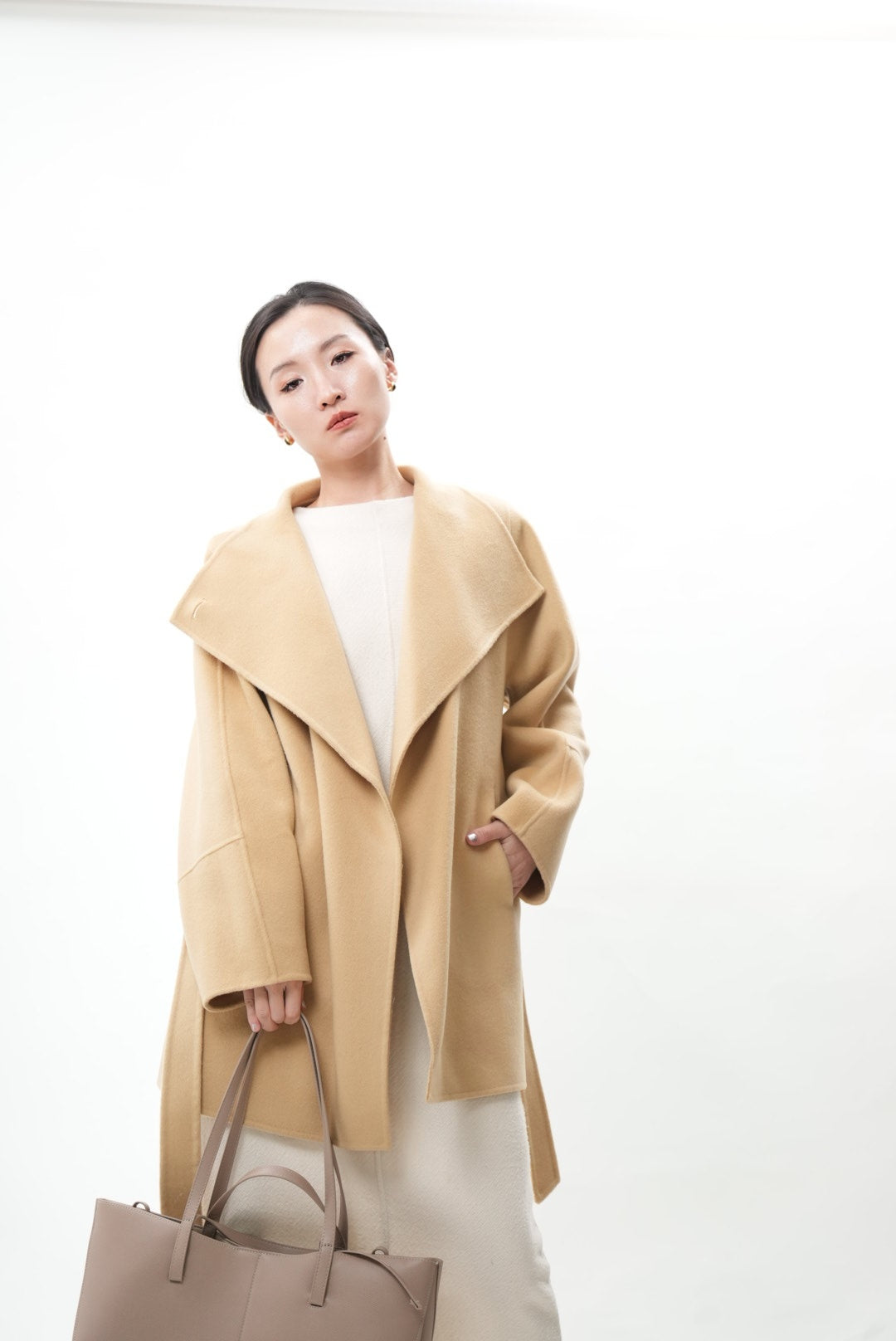 上質なウールとカシミヤを贅沢にブレンドした、柔らかく包み込むような着心地のショートコートです。ウールの暖かさとカシミヤ特有のしなやかな風合いが調和し、軽やかで上品な印象を与えます。