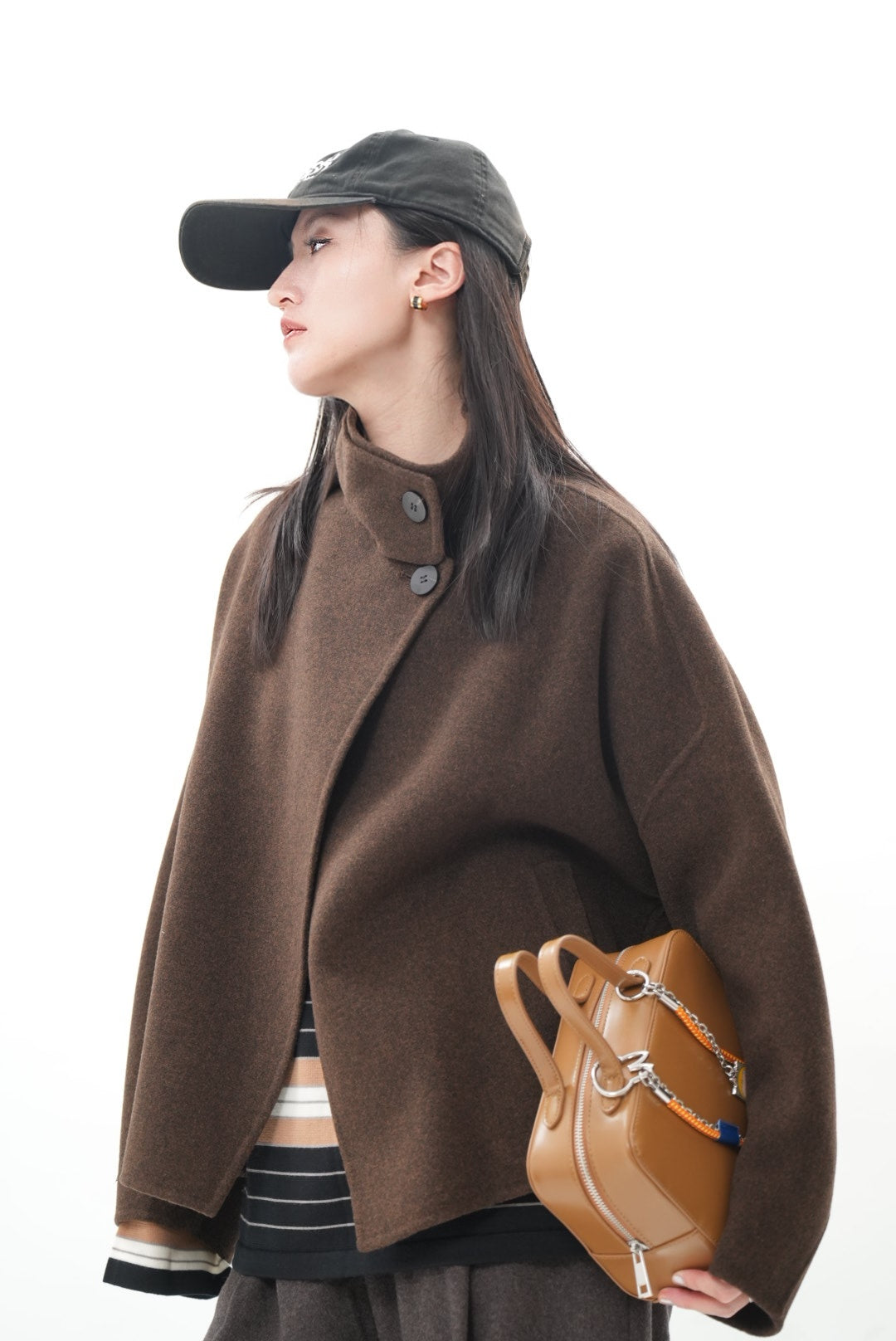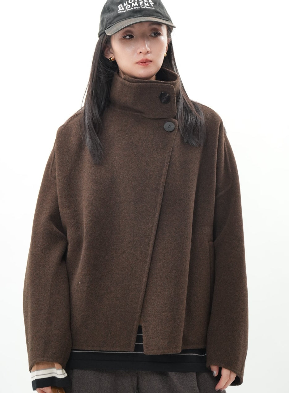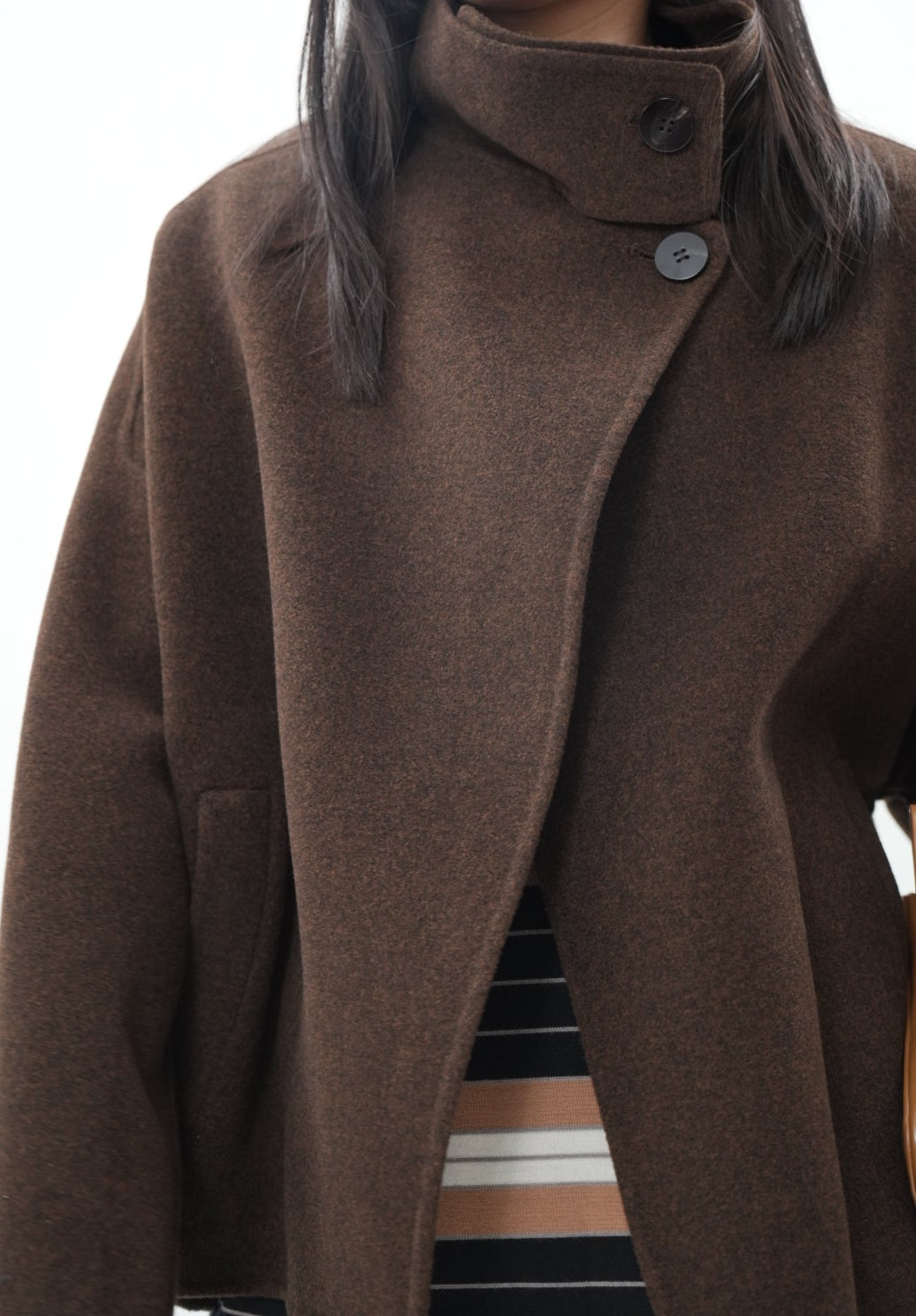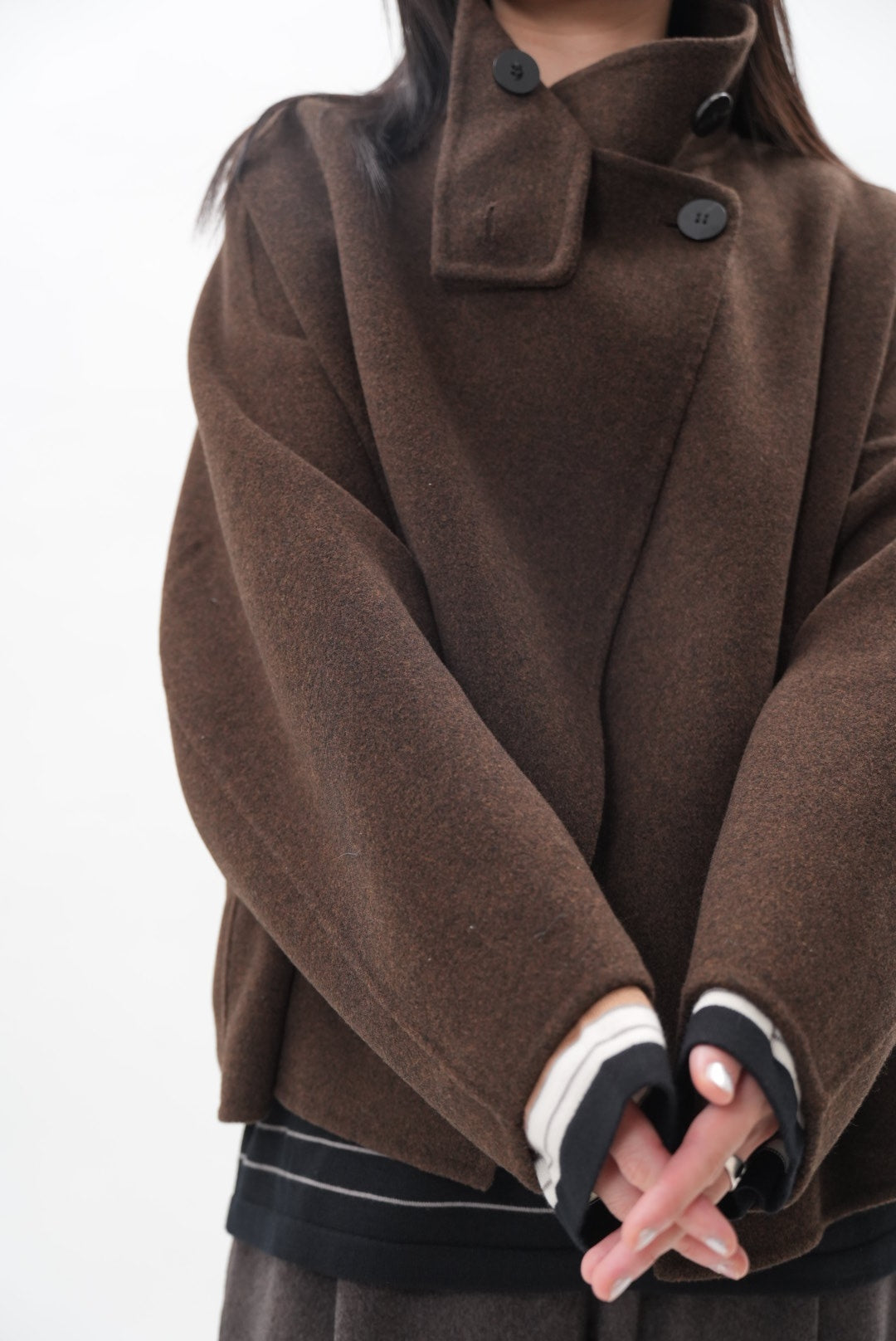 立ち上がりのあるハイネックとアシンメトリーなフロントデザインが、モード感のある表情を演出。